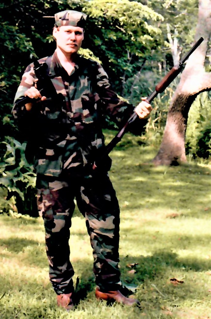 So, this is a picture on me on an intelligence case. Doing a little surveillance out in the woods on the waterfront. What is that in my hand I'm holding up? It is a Mini UZI and it was fierce. We had one while I worked in the Washington Field Office. I went to the State Department to take the UZI qualification course they offered. I can tell you this much, I would not want to be on the receiving end of it. Super high rate of fire...(1000 rounds a minute)...